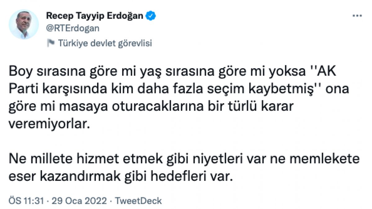 Cumhurbaşkanı Erdoğan'ın, muhalefetin millete hizmet etmek gibi bir niyetinin olmadığını vurguladığı Tweet'te, "Boy sırasına göre mi yaş sırasına göre mi yoksa ''AK Parti karşısında kim daha fazla seçim kaybetmiş'' ona göre mi masaya oturacaklarına bir türlü karar veremiyorlar. Ne millete hizmet etmek gibi niyetleri var ne memlekete eser kazandırmak gibi hedefleri var." ifadeleri yer aldı.