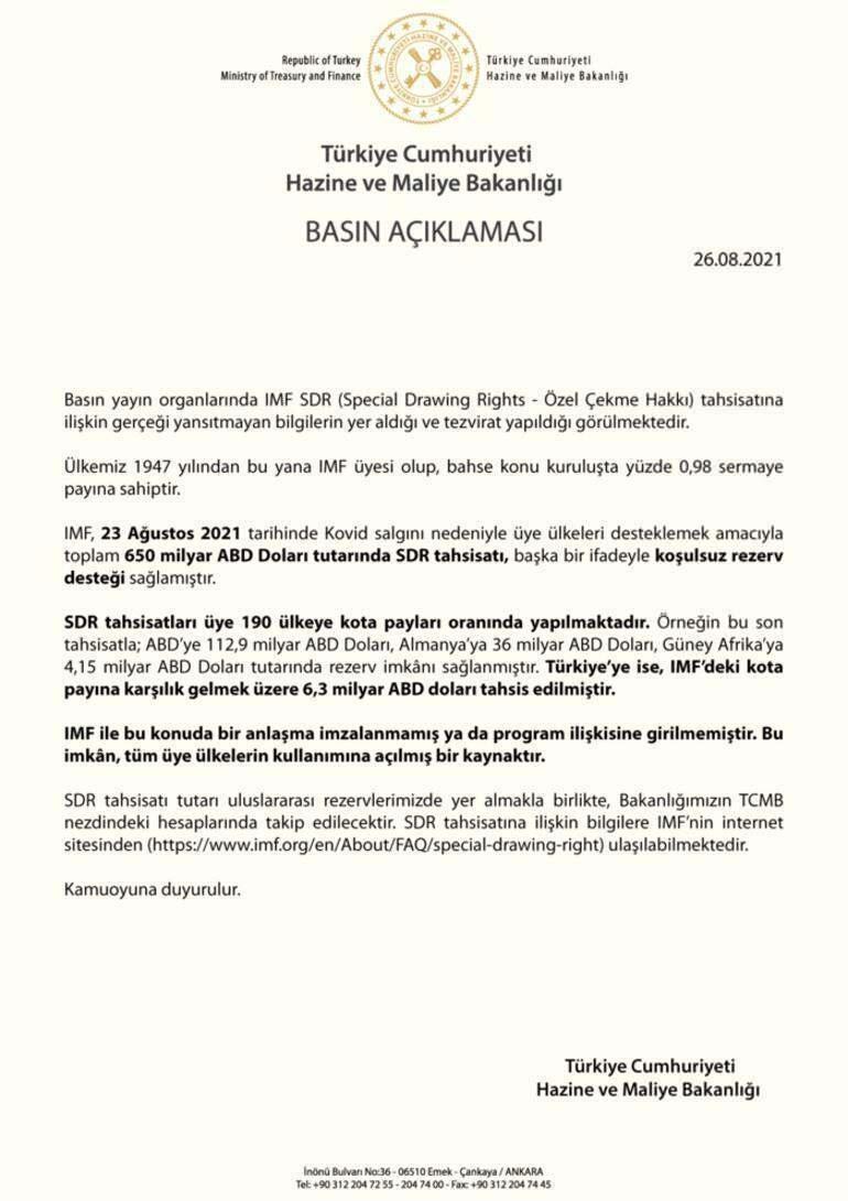 Öte yandan geçtiğimiz günlerde Hazine ve Maliye Bakanlığı'ndan yapılan açıklamada, bazı basın yayın organlarında IMF SDR tahsisatına ilişkin gerçeği yansıtmayan bilgilerin yer aldığı ve tezvirat yapıldığı kaydedilmişti.