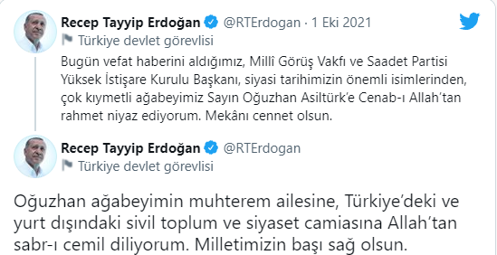 Cumhurbaşkanı Erdoğan, "Bugün vefat haberini aldığımız, Millî Görüş Vakfı ve Saadet Partisi Yüksek İstişare Kurulu Başkanı, siyasi tarihimizin önemli isimlerinden, çok kıymetli ağabeyimiz Sayın Oğuzhan Asiltürk’e Cenab-ı Allah’tan rahmet niyaz ediyorum. Mekânı cennet olsun." mesajını paylaştı.