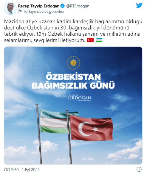 Cumhurbaşkanı Recep Tayyip Erdoğan, "Maziden atiye uzanan kadim kardeşlik bağlarımızın olduğu dost ülke Özbekistan'ın 30. bağımsızlık yıl dönümünü tebrik ediyor, tüm Özbek halkına şahsım ve milletim adına selamlarımı, sevgilerimi iletiyorum." dedi.
