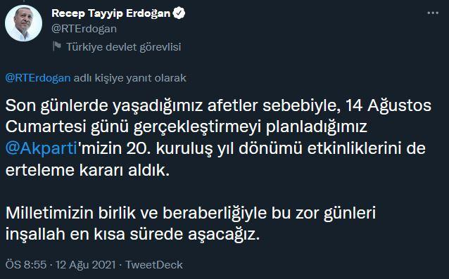 "Son günlerde yaşadığımız afetler sebebiyle, 14 Ağustos Cumartesi günü gerçekleştirmeyi planladığımız AK Parti'mizin 20. kuruluş yıl dönümü etkinliklerini de erteleme kararı aldık"