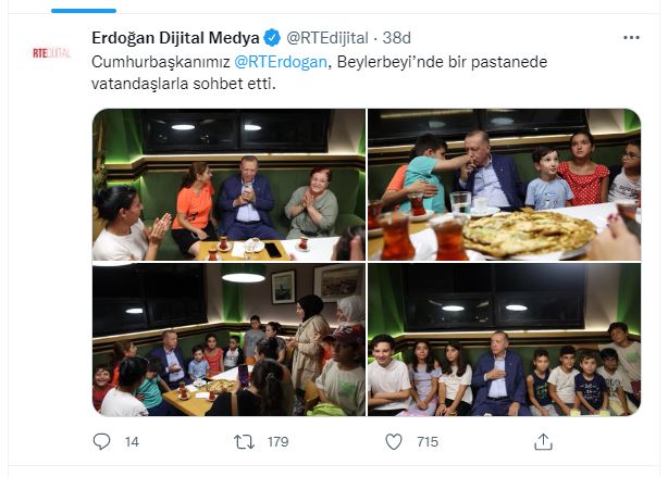Cumhurbaşkanı Erdoğan'dan sürpriz ziyaretCumhurbaşkanı Recep Tayyip Erdoğan Beylerbeyi’nde bir pastanede vatandaşlarla sohbet etti.27 Ağustos 2022, Cumartesi - 22:42 Cumhurbaşkanı Erdoğan Beylerbeyi’nde bir pastanede vatandaşlarla sohbet etti.Cumhurbaşkanı Recep Tayyip Erdoğan, Beylerbeyi’nde bir pastanede vatandaşlarla bir araya geldi.Erdoğan'ın vatandaşlarla sohbet ettiği anlar sosyal medyadan paylaşıldı.Zeki Doruk'un da aralarında olduğu 27 şüpheli hakkında iddianame Etiketler: cumhurbaşkanı erdoğan beylerbeyi pastane