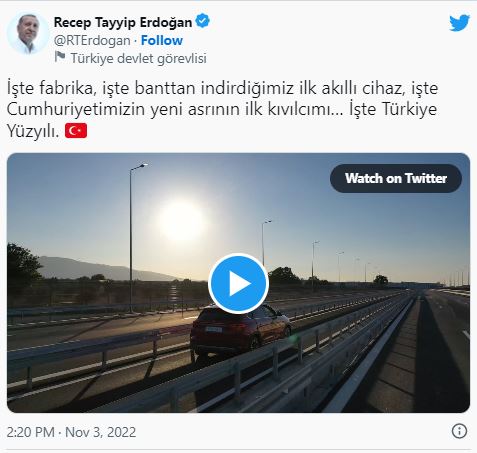Cumhurbaşkanı Recep Tayyip Erdoğan, sosyal medya hesabından yaptığı paylaşımda, "İşte fabrika, işte banttan indirdiğimiz ilk akıllı cihaz, işte Cumhuriyetimizin yeni asrının ilk kıvılcımı… İşte Türkiye Yüzyılı." ifadelerini kullandı.