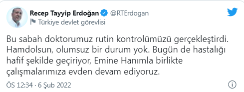 Cumhurbaşkanı Recep Tayyip Erdoğan sosyal medya hesabından hem kendi hem de eşi Emine Erdoğan'ın sağlığı ile ilgili açıklama yaptı. Erdoğan açıklamasında şu ifadelere yer verdi: "Bu sabah doktorumuz rutin kontrolümüzü gerçekleştirdi. Hamdolsun, olumsuz bir durum yok. Bugün de hastalığı hafif şekilde geçiriyor, Emine Hanımla birlikte çalışmalarımıza evden devam ediyoruz."