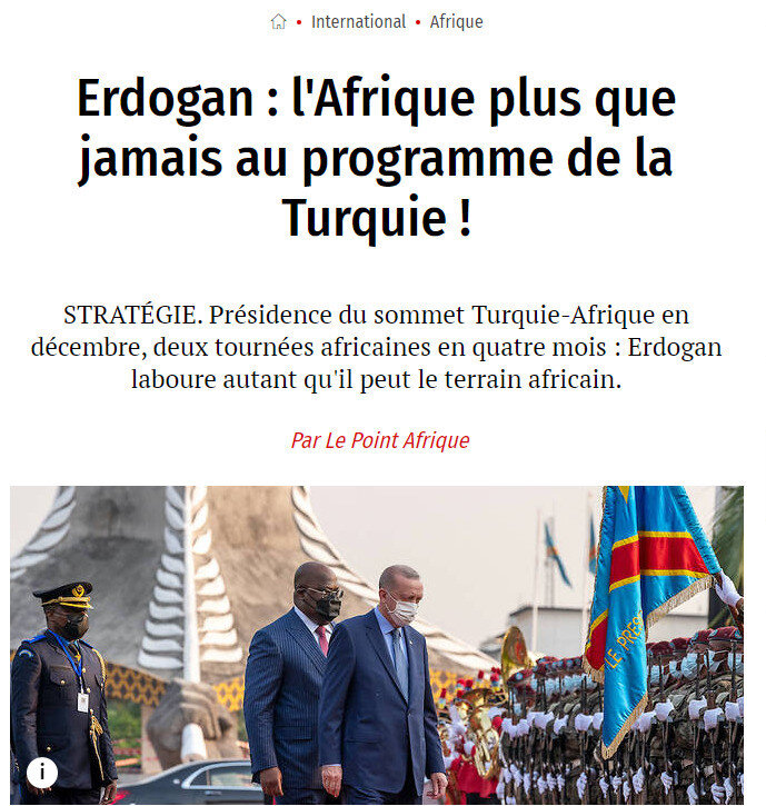 "Cumhurbaşkanı Recep Tayyip Erdoğan Afrika'da olabildiğince sahayı boş bırakmıyor. Ankara, özellikle savunma alanında diplomatik ve aynı zamanda ekonomik ve ticari bağlar geliştirmek için Erdoğan'ın himayesinde son yirmi yılda Afrika'ya büyük yatırımlar yaptı. Erdoğan, hükümet üyeleri ve Türkiye'den iş adamlarından oluşan geniş bir heyet eşliğinde Kongo Devlet Başkanı Felix Tshisekedi ile bir araya geldi. Cumhurbaşkanı Tshisekedi, iki ülke arasında imzalanan ve ilişkilerimizi güçlendirme arzusunu simgeleyen anlaşmalar nedeniyle "Bugün Türkiye ile Demokratik Kongo Cumhuriyeti arasındaki ilişkilerde tarihi bir gün" dedi. Bu anlaşmaların birkaç işbirliği alanı ile özellikle “güvenlik, altyapı, sağlık, ulaşım” ile ilgili olduğunu ve “kazan-kazan işbirliğini” memnuniyetle karşıladığını belirtti."