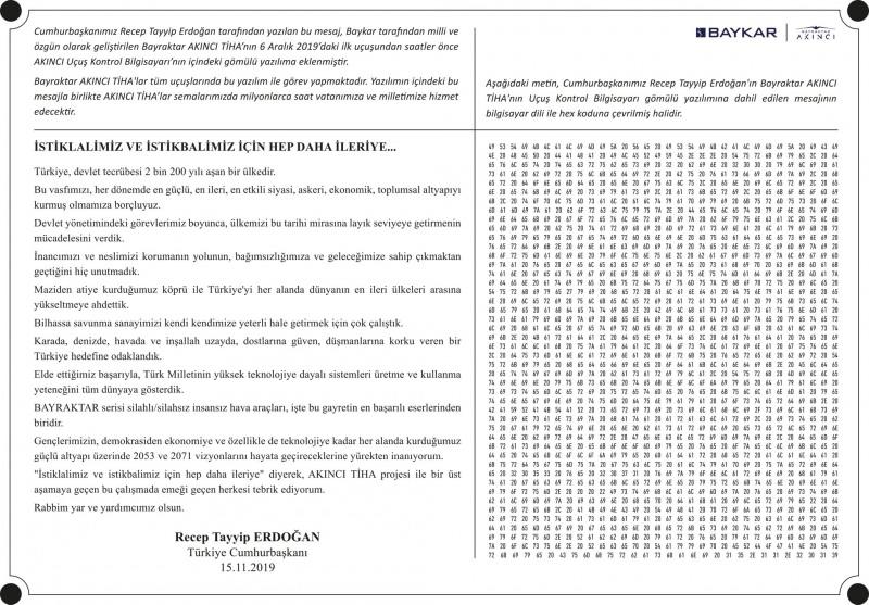 Cumhurbaşkanı Erdoğan tarafından yazılan bir mesaj, Bayraktar AKINCI TİHA’nın 6 Aralık 2019’daki ilk uçuşundan saatler önce AKINCI Uçuş Kontrol Bilgisayarı’nın içindeki gömülü yazılıma eklenmiş. Bayraktar AKINCI TİHA'ların tüm uçuşlarında bu yazılım ile görev yaptığı öğrenildi.
