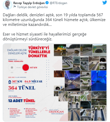"Dağları deldik, denizleri aştık. Türkiye'yi tünellerle donattık." başlıklı grafikte ise 2002 yılında 50 kilometre olan karayolu tüneli uzunluğunun 2021'de 617 kilometreye ulaştığı bilgisi yer aldı. Grafikte ayrıca 2003-2021 yılları arasında 567 kilometre uzunluğunda ve 64,9 milyar Türk lirası maliyetle 364 tünelin yapıldığı belirtildi.