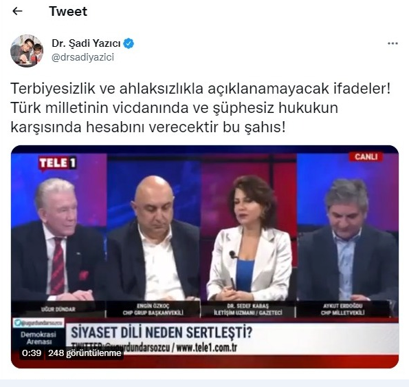 Gazeteci Sedef Kabaş, Cumhuriyet Halk Partisi Grup Başkanvekili Engin Özkoç ve Cumhuriyet Halk Partisi İstanbul Milletvekili Aykut Erdoğdu’nun da bulunduğu programda Cumhurbaşkanı Recep Tayyip Erdoğan’a küstah ifadeler kullandı. Tuzla Belediye Başkanı Dr. Şadi Yazıcı, sosyal medya hesabından Sedef Kabaş’a sert tepki göstererek;” Terbiyesizlik ve ahlaksızlıkla açıklanamayacak ifadeler. Türk milletinin vicdanında ve şüphesiz hukukun karşısında hesabını verecektir bu şahıs” ifadelerini kullandı.