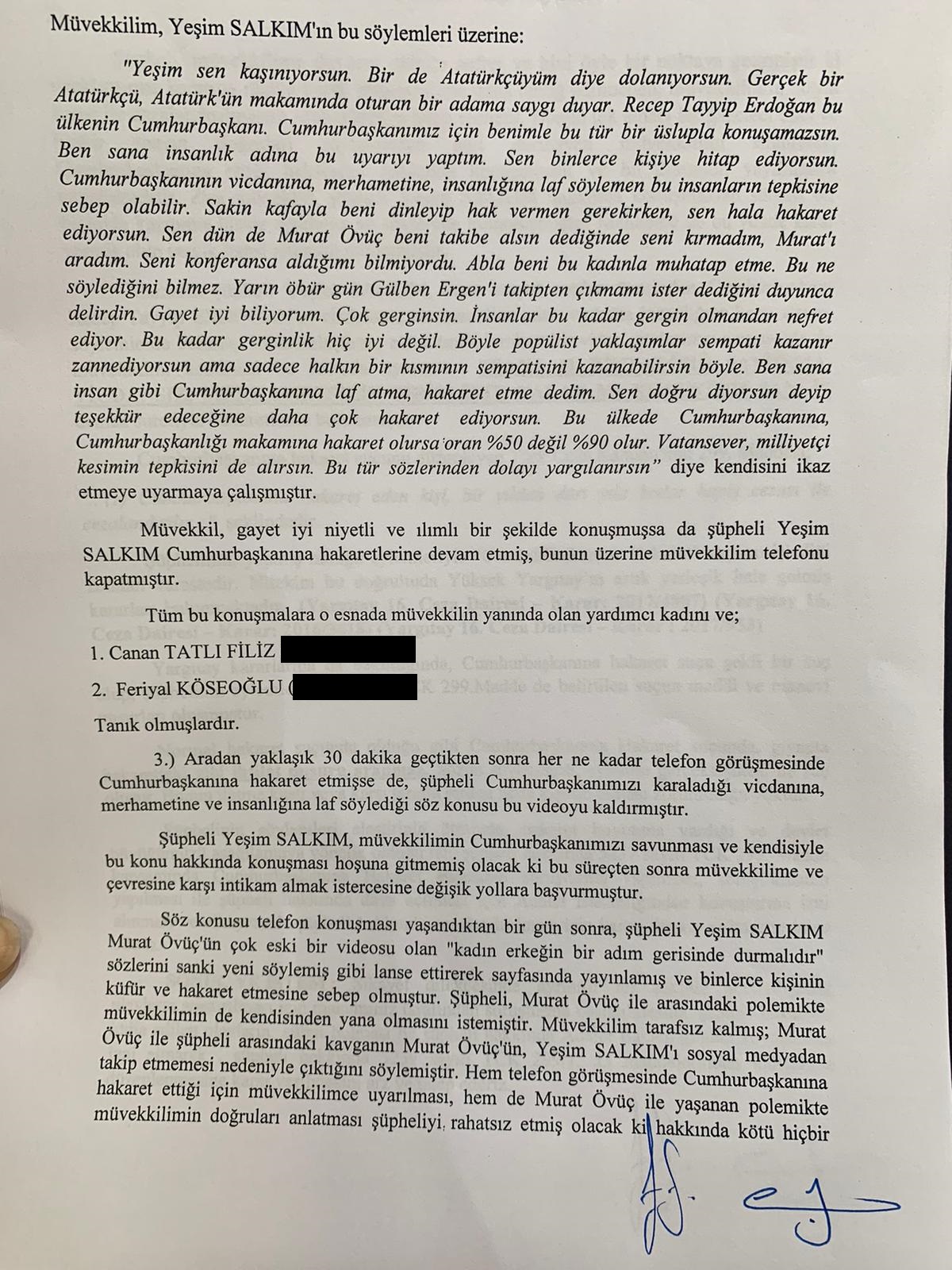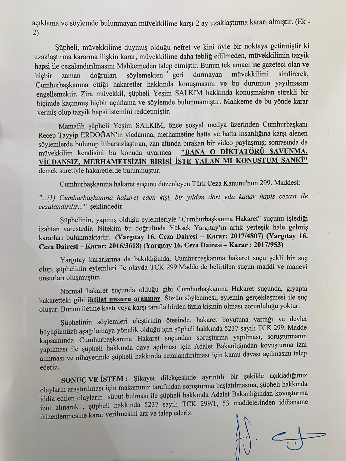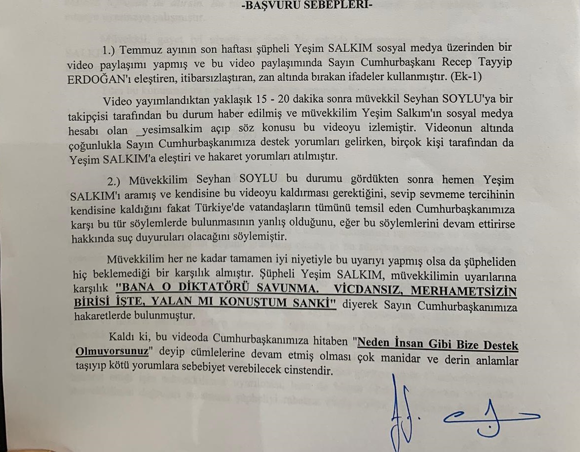 Her oturumda ve canlı yayında cumhurbaşkanına olan saygısını açıkça belirten Seyhan Soylu, "Atatürk’ün makamında oturan Cumhurbaşkanımıza kimse hakaret edemez" diyerek soluğu yargıda aldı ve Yeşim Salkım'ın paylaştığı videoyu delil olarak sunarak savcılığa suç duyurusunda bulundu.