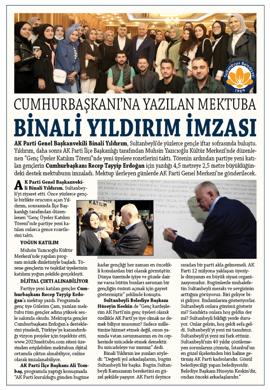 AK Parti Genel Başkanvekili Binali Yıldırım, Sultanbeyli’yi ziyaret etti. Önce yüzlerce gençle birlikte orucunu açan Yıldırım, sonrasında İlçe Başkanlığı tarafından düzenlenen “Genç Üyeler Katılım Töreni”nde partiye yeni katılan onlarca gence rozetlerini taktı. Muhsin Yazıcıoğlu Kültür Merkezi’nde yapılan program müzik dinletisiyle başladı. Törene gençlerin ve teşkilat üyelerinin katılımı yoğun şekilde gerçekleşti.