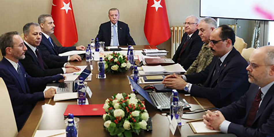 Toplantıya, Dışişleri Bakanı Hakan Fidan, İçişleri Bakanı Ali Yerlikaya, Millî Savunma Bakanı Yaşar Güler, Genelkurmay Başkanı Orgeneral Metin Gürak, Millî İstihbarat Teşkilatı Başkanı İbrahim Kalın, Cumhurbaşkanlığı İletişim Başkanı Fahrettin Altun ve Cumhurbaşkanı Dış Politika ve Güvenlik Başdanışmanı Akif Çağatay Kılıç katıldı.