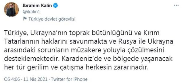 Sözcü Kalın, Twitter hesabından yaptığı açıklamada, "Türkiye, Ukrayna’nın toprak bütünlüğünü ve Kırım Tatarlarının haklarını savunmakta ve Rusya ile Ukrayna arasındaki sorunların müzakere yoluyla çözülmesini desteklemektedir. Karadeniz’de ve bölgede yaşanacak her tür gerilim ve çatışma herkesin zararınadır" ifadesini kullandı.