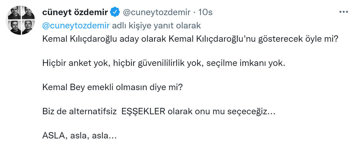 Gazeteci Cüneyt Özdemir, YouTube kanalındaki yayında 6'lı masaya Cumhurbaşkanlığı adaylığı eleştirisinde bulunmuştu. Muhalefeti eleştiren Özdemir, "Altılı masa kamuoyunun tepkisine bakmadan herkesi çantada keklik görüyor olabilir ama bir dakika arkadaş. Aramızdan birini seçeceğiz siz de gelip bize oy vereceksiniz. Böyle bir saçmalık olabilir mi ya? Sen gidip oy verir misin böyle bir şeye?" ifadelerini kullanmıştı.