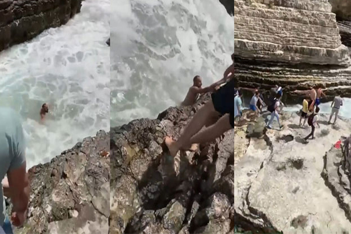 Denizde dalgalara kapılan şahıs boğulma tehlikesi yaşarken, olayı gören vatandaşlar hemen gencin yardımına koştu. Kayalıklarda dalgalarla birlikte sürüklenen şahıs vatandaşlar tarafından uzatılan havluya tutundu.
