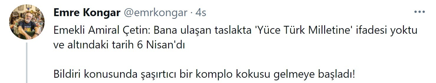 Cumhuriyet'te köşe karalayan "dinozor" Emre Kongar, Semih Çetin'in açıklamasından "komplo" sonucunu çıkardı. Kongar, söz konusu bildirinin emekli amirallere yönelik bir komplo olduğunu ileri sürdü. Twitter hesabından paylaşım yapan Kongar, "Bildiri konusunda şaşırtıcı bir komplo kokusu gelmeye başladı!" dedi.