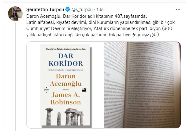 Turpcu, "Daron Acemoğlu, Dar Koridor adlı kitabının 487.sayfasında; Latin alfabesi, kıyafet devrimi, dini kurumların yapılandırılması gibi birçok Cumhuriyet Devrimini eleştiriyor, Atatürk dönemine tek parti diyor. (600 yıllık padişahlıktan değil de çok partiden tek partiye geçmişiz gibi). Hacer Foggo ya da bir başkaları Atatürk Türkiye’sini beğenmeyebilirler, eyvallah ama CHP’nin en önlerde yer alabilirler mi bilemedim; kıyaslamaya ve vurguya bakar mısınız? tüm yaşamını sola ve CHP’ye vermiş olan benim gibi düşünenlerde bir ayarsızlık mı var anlayamadım." dedi.
