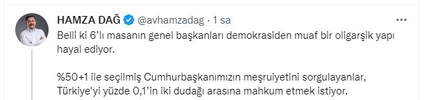 Hamza Dağ, Davutoğlu'nun "Cumhurbaşkanı içeriden veya dışarıdan olsun, Genel Başkanlar doğrudan karar süreçleri içerisinde imza yetkisine sahip olacak." şeklinde açıklamasına tepki göstererek, "Belli ki 6'lı masanın genel başkanları demokrasiden muaf bir oligarşik yapı hayal ediyor. %50+1 ile seçilmiş Cumhurbaşkanımızın meşruiyetini sorgulayanlar, Türkiye'yi yüzde 0,1'in iki dudağı arasına mahkum etmek istiyor" dedi.