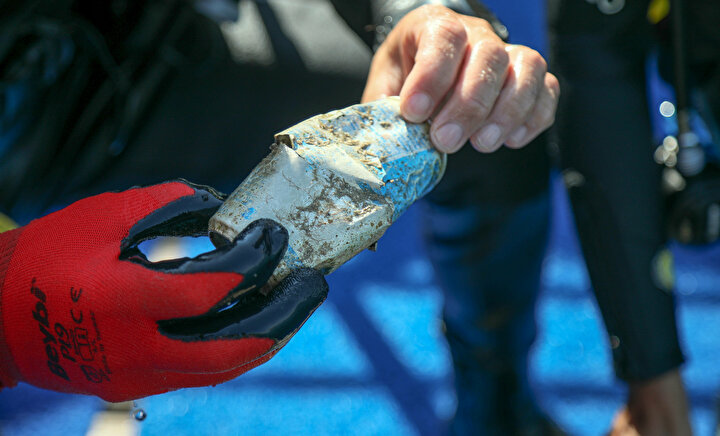 Maske ve eldivenlerin doğada kolay yok olmadığını vurgulayan İsa Alamder, 10 metre derinlikten başlayıp 30 metre derinliğe kadar bin metrekare alanı tarayarak çöp topladıklarını ifade etti.