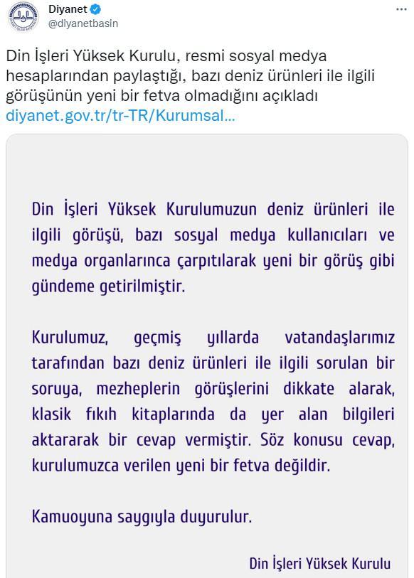 Açıklamada, "Kurulumuz, geçmiş yıllarda vatandaşlarımız tarafından bazı deniz ürünleriyle ilgili sorulan bir soruya mezheplerin görüşlerini dikkate alarak klasik fıkıh kitaplarında da yer alan bilgileri aktararak bir cevap vermiştir. Söz konusu cevap, kurulumuzca verilen yeni bir fetva değildir." ifadeleri kullanıldı.