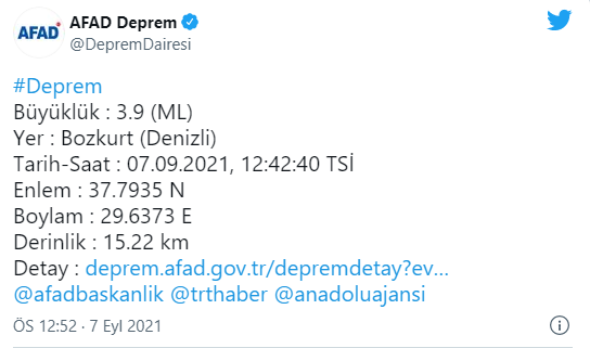 AFAD'ın son dakika açıklamasına göre Denizli Bozkurt'ta 3,9 büyüklüğünde deprem meydana geldi.