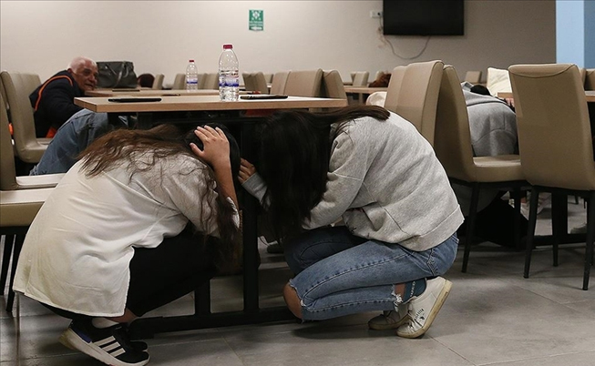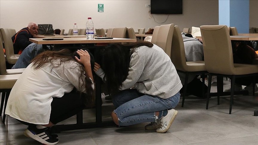 Tatbikat kapsamında, mesajın duyulmasıyla güvenli görülen bir yerde, sağlam bir nesnenin yanına ya da altına çöküldü.