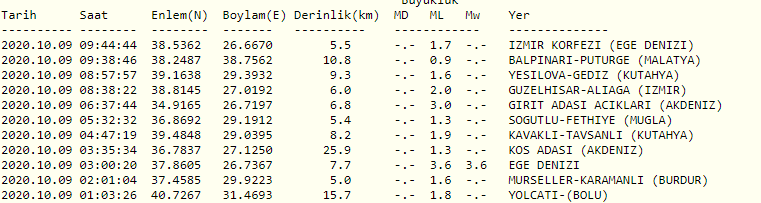 Kandilli Rasathanesi tarafından yapılan son depremler listesi şu şekilde;