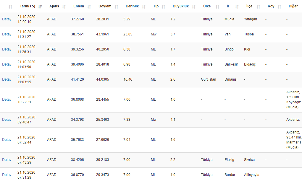 AFAD tarafından yapılan son deprem ölçümleri şu şekilde listeleniyor: