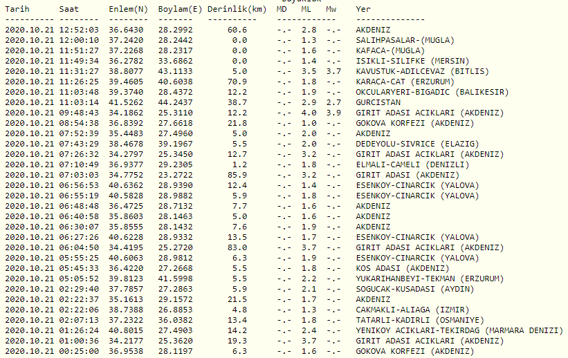 Kandilli Rasathanesi tarafından yapılan son deprem ölçümleri şu şekilde listeleniyor: