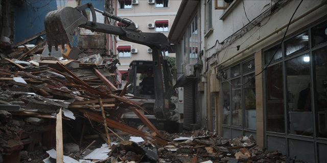 İş yeri dar sokakta olduğu için küçük iş makineleriyle bölgeye gelen ekipler, enkazdan çıkan molozları ana caddeye taşıyarak kamyonlara yüklüyor.