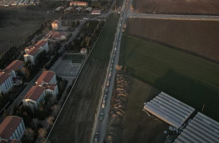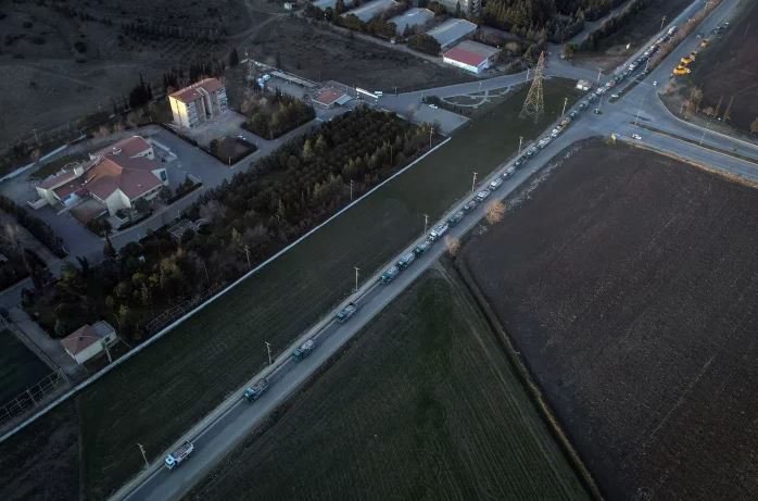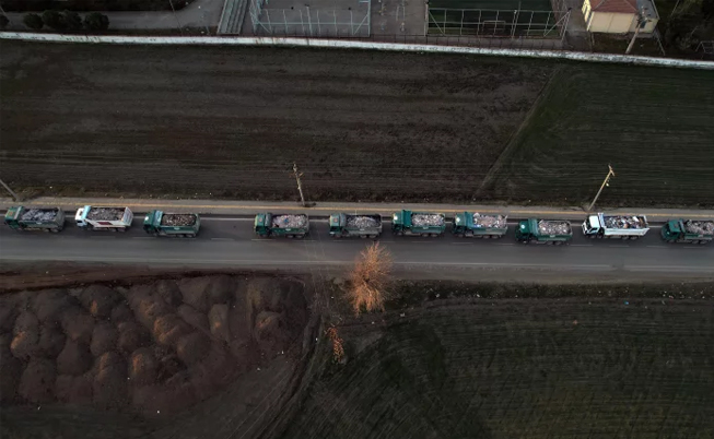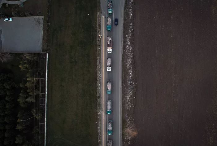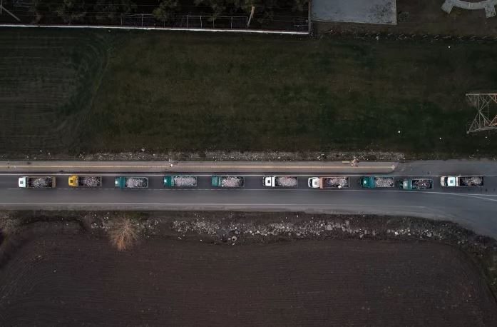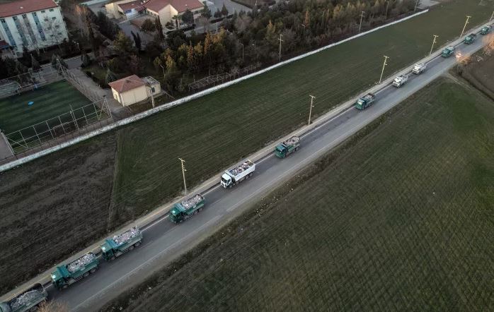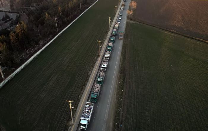 Kamyonların enkazı boşalttıkları alana giderken oluşturduğu metrelerce kuyruk, drone ile havadan görüntülendi.