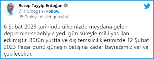 Cumhurbaşkanı Erdoğan, merkez üssü Kahramanmaraş'ın Pazarcık ve Elbistan ilçeleri olan ve 10 ili etkileyen 7,7 ve 7,6 büyüklüğündeki depremler sebebiyle 7 gün süreyle milli yas ilan edildiğini açıkladı. Erdoğan imzasıyla yayımlanan genelgede bütün yurtta ve dış temsilciliklerde 12 Şubat Pazar günü güneşin batışına kadar Türk bayrağının yarıya indirileceği belirtildi.