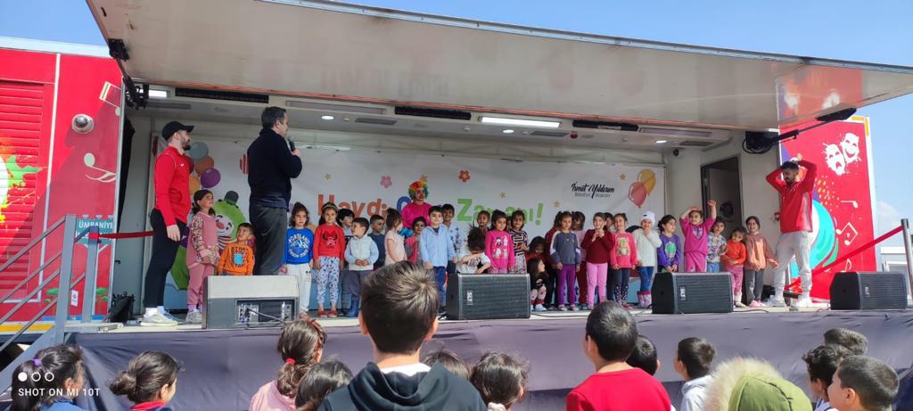 Kahramanmaraş merkezli depremlerin ardından, Onikişubat’ta yaşayan afetzedelerin yaralarının sarılması için gece gündüz demeden çalışmalarını sürdüren Ümraniye Belediyesi, depremzede çocukları bir an olsun yalnız bırakmıyor.