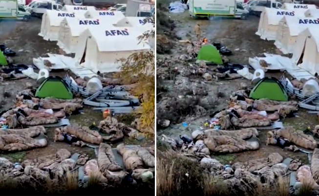 Sosyal medyaya yansıya görüntülerde AFAD çadırlarının yanında arama kurtarma çalışmalarına ara veren askerlerimizin uyku tulumları içinde dinlendikleri görüldü.