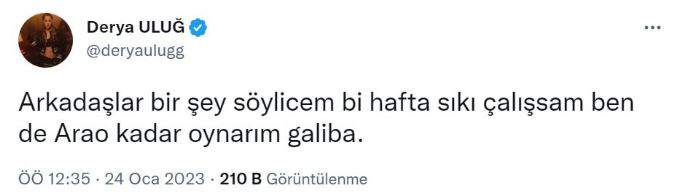 Spor Toto Süper Lig’in 20. haftasında Fenerbahçe Ümraniyespor’u 2-1 mağlup ederken, şarkıcı Derya Uluğ, Twitter hesabından sarı-lacivertli futbolcu Arao için “Arkadaşlar bir şey söyleyeceğim bir hafta sıkı çalışsam ben de Arao kadar oynarım galiba” yorumunu yaptı.