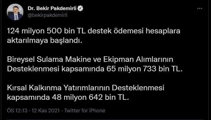 Tarım ve Orman Bakanı Bekir Pakdemirli, Twitter'daki hesabından yaptığı açıklamada, "124 milyon 500 bin TL destek ödemesi hesaplara aktarılmaya başlandı. Bireysel Sulama Makine ve Ekipman Alımlarının Desteklenmesi kapsamında 65 milyon 733 bin TL, Kalkınma Yatırımlarının Desteklenmesi kapsamında 48 milyon 642 bin TL, Lisanslı Depolarda Ürün Depolama Kira Desteği kapsamında 10 milyon 123 bin TL, toplamda 124 milyon 500 bin TL'lik destek ödemesini hesaplara aktarmaya başladık. Hayırlı bereketli olsun" dedi.
