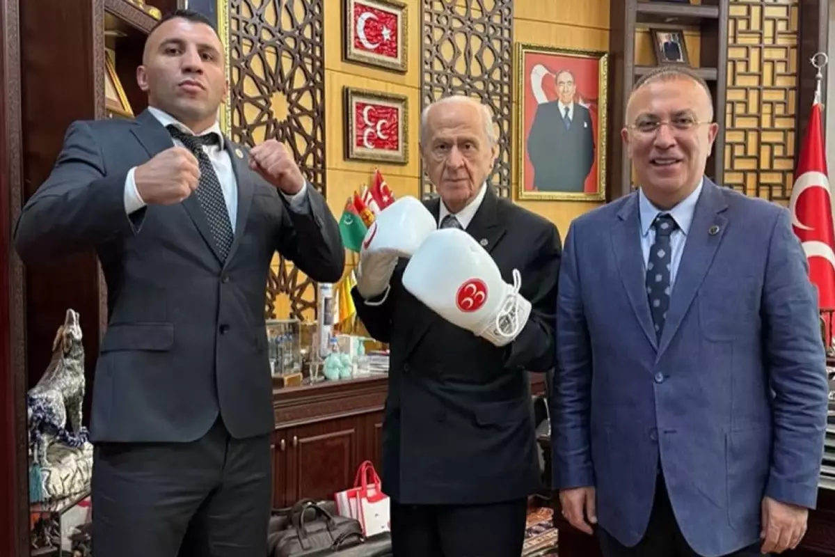 MHP Genel Başkanı Devlet Bahçeli, şampiyon boksör olan Avni Yıldırım'ı makamında kabul etti. Bahçeli, ziyaret sonrası çekilen hatıra fotoğrafında ise boks eldivenleri ile poz verdi. Söz konusu kare, sosyal medyada geniş yankı uyandırdı ve kısa sürede gündem oldu.