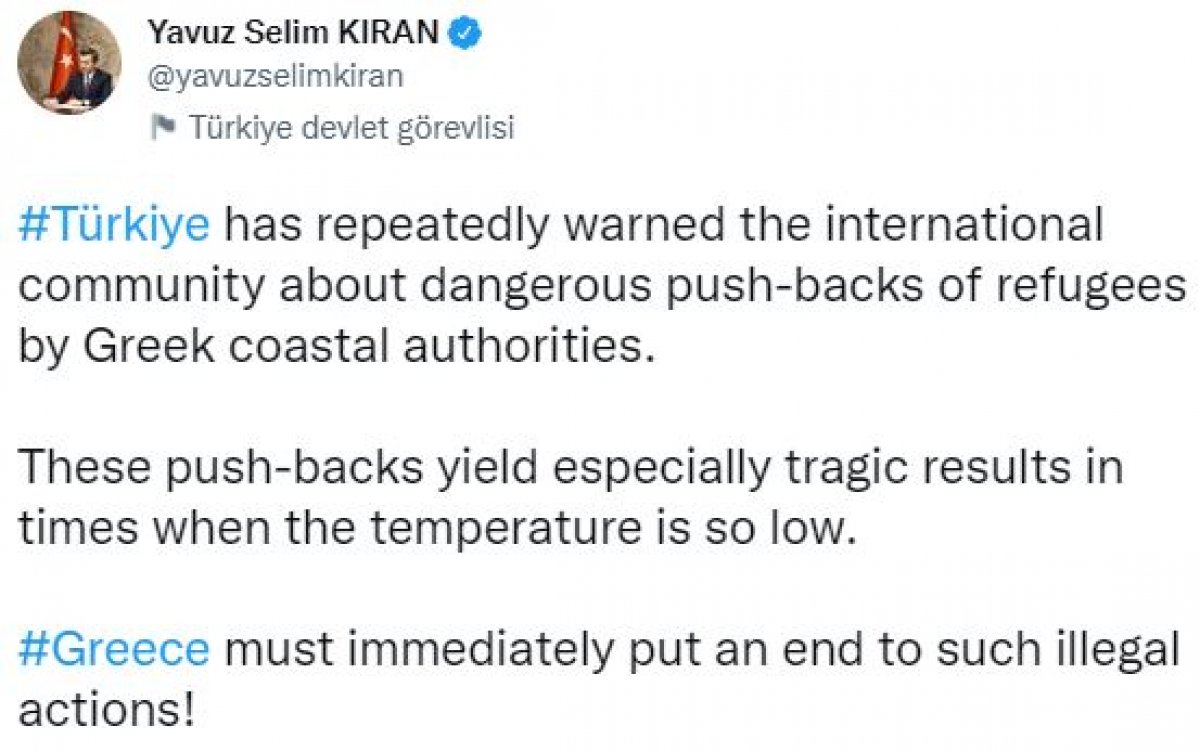 "Türkiye, Yunanistan sahil güvenlik yetkililerinin tehlikeli biçimde mültecileri geri itmesine ilişkin uluslararası toplumu defalarca uyardı. Bu geri itme faaliyetleri özellikle havanın çok soğuk olduğu zamanlarda trajik sonuçlar doğuruyor. Yunanistan, bir an önce bu yasa dışı faaliyetlerine son vermelidir."