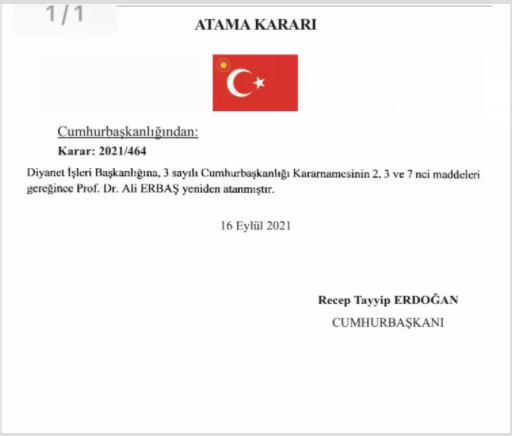 17.09.2017 Tarihinde, 15.08.2017 Tarihli ve 2017/10822 Sayılı Kararname ile Diyanet İşleri Başkanlığı’na atandı.