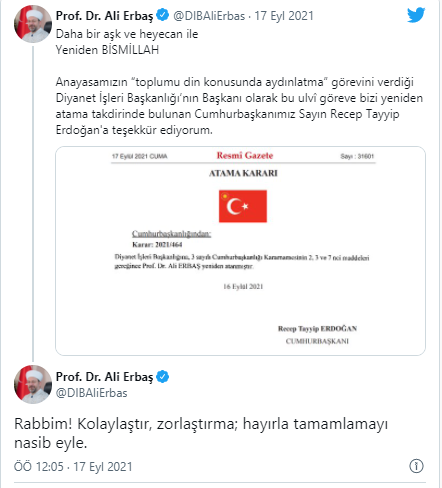Prof. Dr. Erbaş, Twitter hesabından Diyanet İşleri Başkanlığına yeniden atanmasına ilişkin Resmi Gazete'de yayımlanan kararı, "Daha bir aşk ve heyecan ile yeniden Bismillah." mesajı ile paylaşarak, şunları kaydetti: