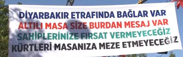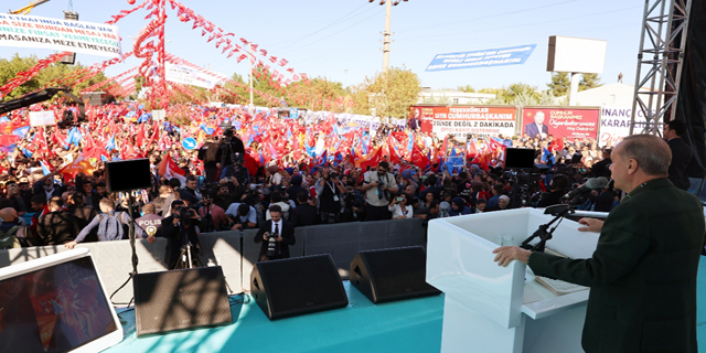 Erdoğan, "Ak yolda hak yolda ak kadınlar reisinin yanında. Bak şimdi pankartlar kalkıyor, Can-ı Ciğer Erdoğan. Maşallah bu ne coşku. Şimdi bir pankart daha var. Diyarbakır etrafında bağlar var, 6'lı masa size buradan mesaj var, sahiplerinize fırsat vermeyeceğiz, Kürtleri masanıza meze etmeyeceğiz." dedi.