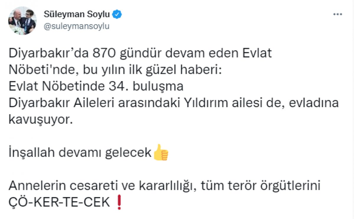 İçişleri Bakanı Süleyman Soylu, dün Twitter hesabından 34’üncü buluşmanın müjdesini verdi Bakan Soylu paylaşımında, "Diyarbakır'da 870 gündür devam eden evlat nöbetinde, bu yılın ilk güzel haberi: Evlat Nöbeti'nde 34'üncü buluşma, Diyarbakır aileleri arasındaki Yıldırım ailesi de evladına kavuşuyor. İnşallah devamı gelecek, annelerin cesareti ve kararlılığı, tüm terör örgütlerini çökertecek." dedi.