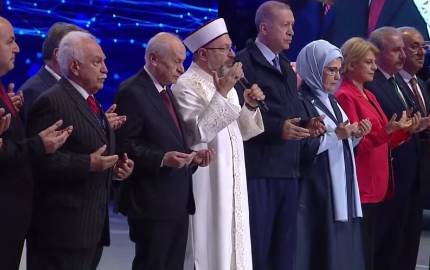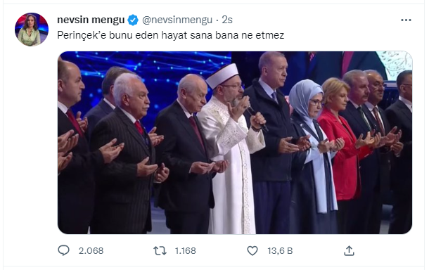 Doğu Perinçek'in tören sırasında Cumhurbaşkanı Recep Tayyip Erdoğan ile birlikte dua ederken çekilen bir kareyi gazeteci Nevşin Mengü resmi Twitter hesabından paylaştı.