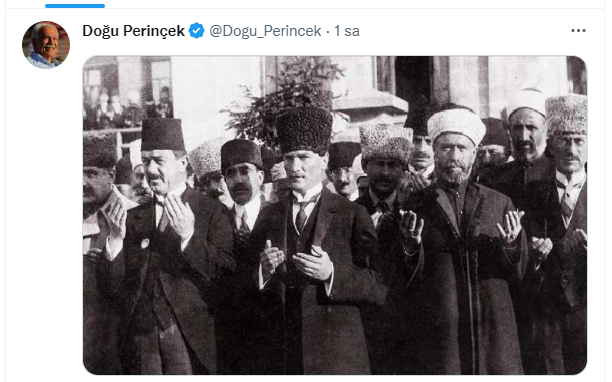 Bunun üzerine Mengü'nün attığı tweeti alıntılayan Perinçek, Atatürk'ün Büyük Millet Meclisi açılırken dua ettiği bir fotoğrafı paylaştı. Perinçek'in paylaşımı büyük beğeni aldı.