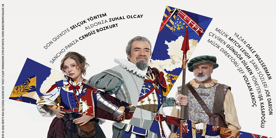 Miguel de Cervantes’in bu ölümsüz eseri, bu kez usta yönetmen Işıl Kasapoğlu’nun yönetiminde; Selçuk Yöntem, Zuhal Olcay ve Cengiz Bozkurt’un başrolleriyle sahnede hayat bulacak.30 kişilik dansçı ve oyuncu kadrosu, 15 kişilik canlı orkestra, görkemli dekor, çarpıcı ışık ve kostüm tasarımlarıyla tam 80 kişilik dev bir prodüksiyon olarak yeniden doğuyor.