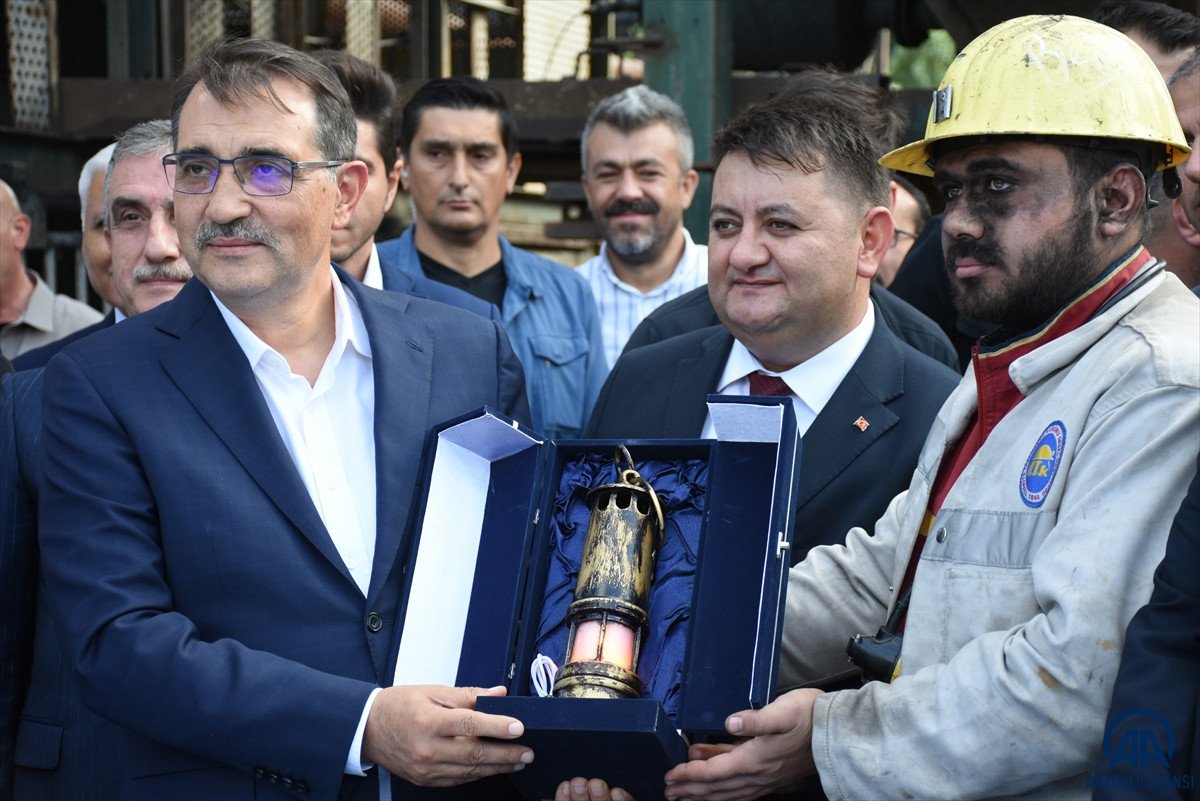 Konuşmaların ardından Bakan Fatih Dönmez’e işçiler tarafından madenci feneri hediye edildi.