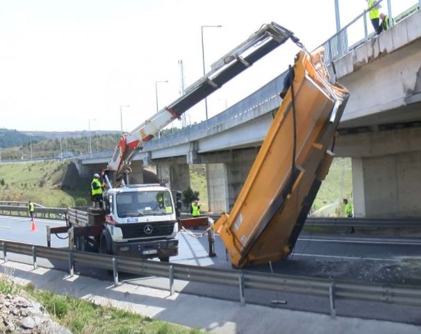 İstanbul'un Beykoz ilçesinde, Kuzey Marmara Otoyolu Ümraniye bağlantı yolunda Ümraniye istikametine giden hafriyat kamyonunun dorsesi açıldı.