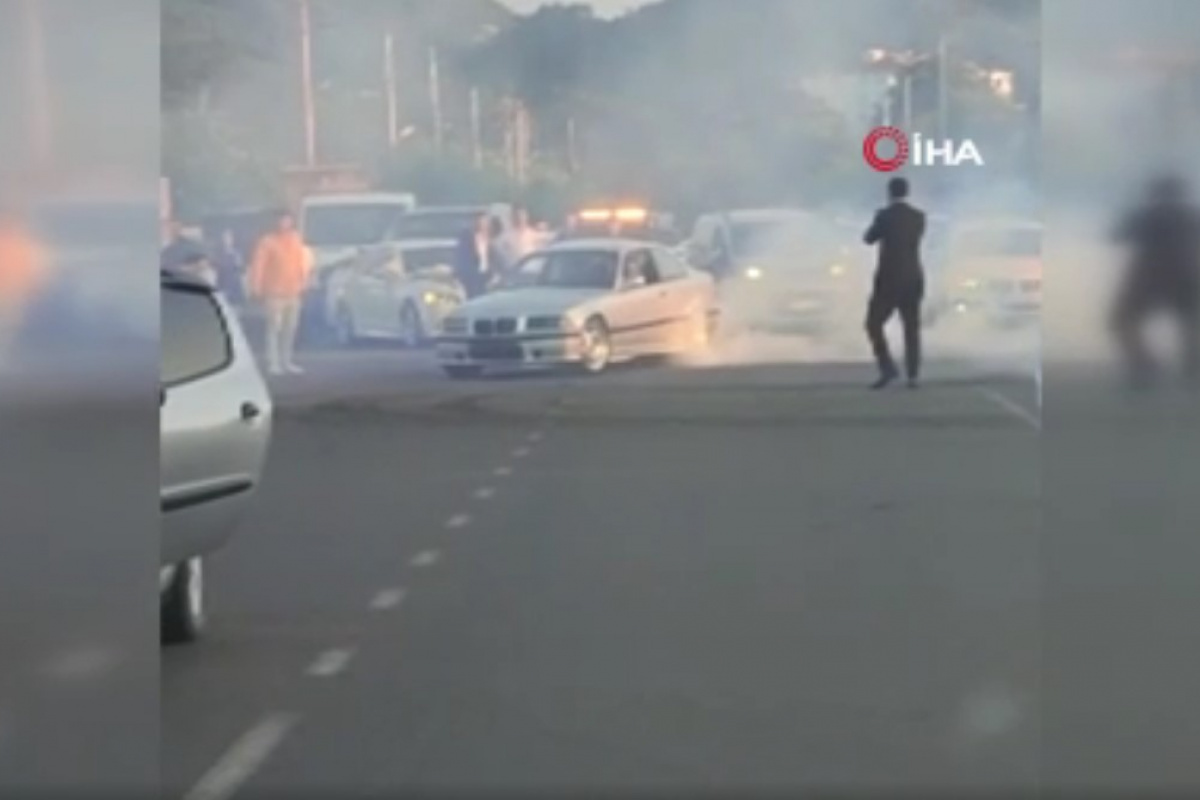 Öte yandan sosyal medyada paylaşılan görüntülerde, sürücünün drift yaparken sahil yolunu kapattığı ve kendi etrafında döndüğü, bir kameramanın o anları kaydettiği ve damadın ise sürücüye alkış tuttuğu anlar yer aldı.