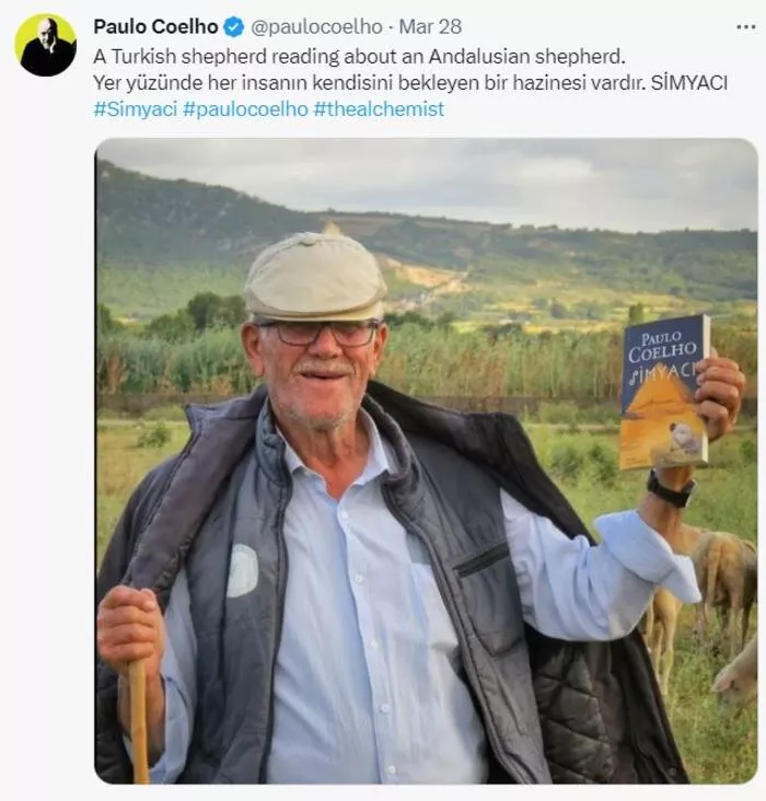 Coelho, dün 1996 yılında Türkçe yayınlanan romanı elinde tutan ‘Türk çobanın’ fotoğrafıyla birlikte “Bir Türk çoban, Endülüslü bir çoban hakkında yazılanları okuyor. Yer yüzünde her insanın kendisini bekleyen bir hazinesi vardır. SİMYACI” mesajını paylaştı.