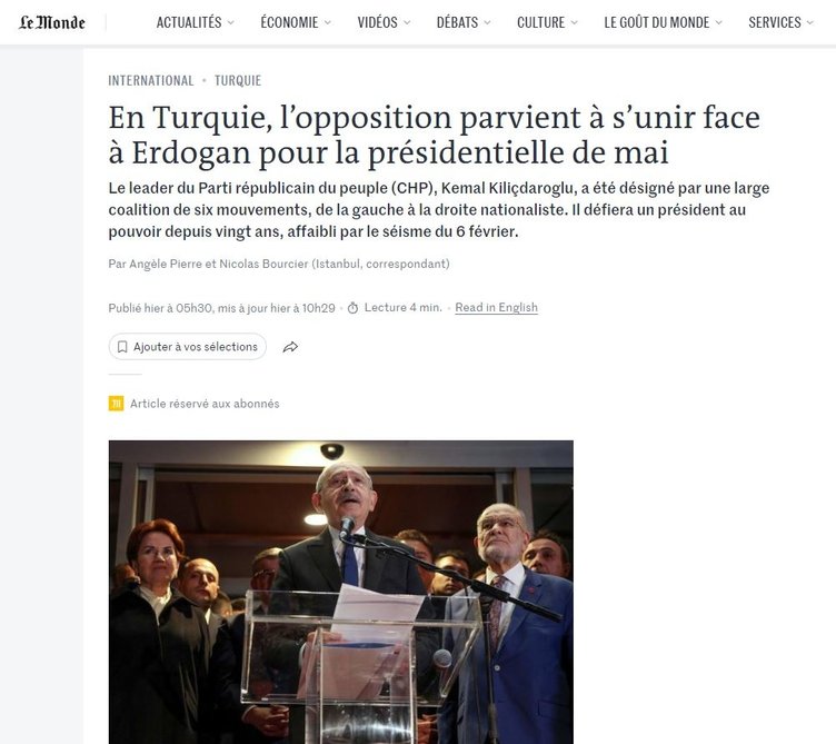 Fransız Le Monde de benzer bir başlık ile okuyucularının karşısına çıktı. Kemal Kılıçdaroğlu'nun yirmi yıldır iktidarda olan Başkan Erdoğan'a karşı yarışacağını vurgulayan gazete, "Kemal Kılıçdaroğlu, son günlerde aylarca süren müzakereler psikodramalardan sonra aday olarak belirlendi" dedi.