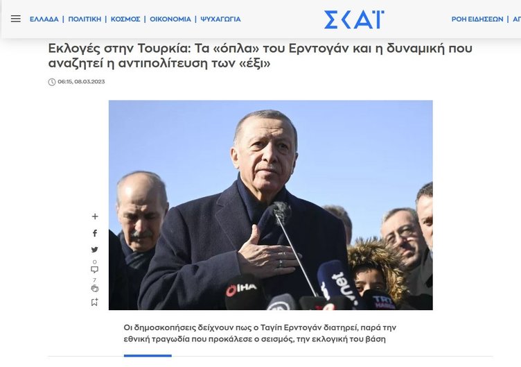 Yunan Skai ise, Deprem trajedisine rağmen Erdoğan'ın seçmen tabanını koruduğu yazıldı. Başkan Erdoğan'ın arka arkaya 21 yıl iktidarda bulunduğu vurgulanan gazetede, Kemal Kılıçdaroğlu'nun İstanbul ve Ankara büyükşehir belediyeleri ile itibar kazanmış olabileceğini ancak seçmeni ikna etmekte zorlandığı ifade edildi.